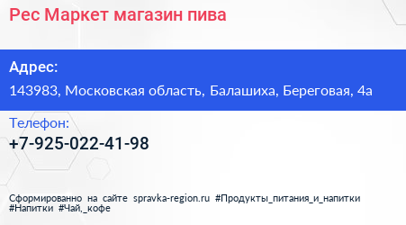 Рес-Маркет, магазин пива по адресу 143983, Московская область, Балашиха, Береговая, 4а в дальнейшем Организация, размещена в следующих категориях: