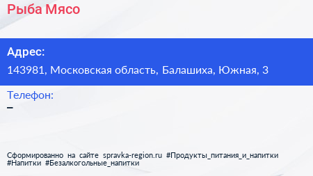 Рыба Мясо по адресу 143981, Московская область, Балашиха, Южная, 3 в дальнейшем Организация, размещена в следующих категориях: