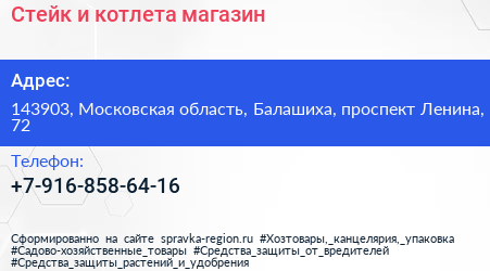 Стейк и котлета, магазин по адресу 143903, Московская область, Балашиха, проспект Ленина, 72 в дальнейшем Организация, размещена в следующих категориях: