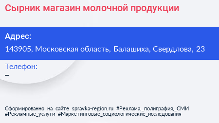 Сырник, магазин молочной продукции по адресу 143905, Московская область, Балашиха, Свердлова, 23 в дальнейшем Организация, размещена в следующих категориях: