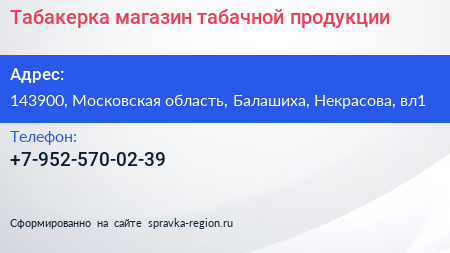 Табакерка, магазин табачной продукции по адресу 143900, Московская область, Балашиха, Некрасова, вл1 в дальнейшем Организация, размещена в следующих категориях: