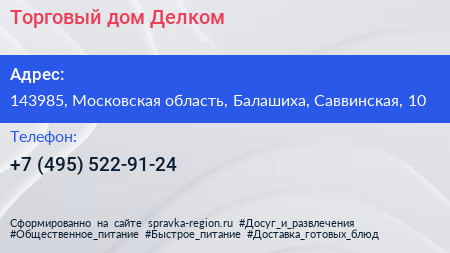 Торговый дом Делком по адресу 143985, Московская область, Балашиха, Саввинская, 10 в дальнейшем Организация, размещена в следующих категориях: