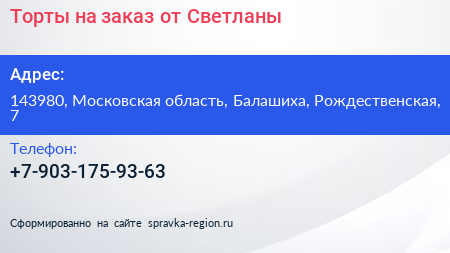 Торты на заказ от Светланы по адресу 143980, Московская область, Балашиха, Рождественская, 7 в дальнейшем Организация, размещена в следующих категориях: