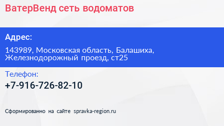 ВатерВенд, сеть водоматов по адресу 143989, Московская область, Балашиха, Железнодорожный проезд, ст25 в дальнейшем Организация, размещена в следующих категориях: