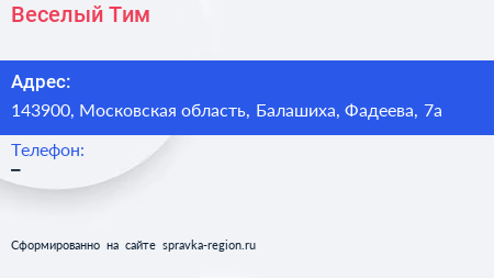 Веселый Тим по адресу 143900, Московская область, Балашиха, Фадеева, 7а в дальнейшем Организация, размещена в следующих категориях: