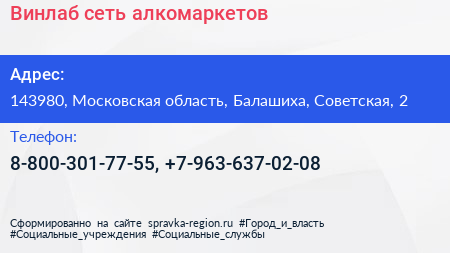 Винлаб, сеть алкомаркетов по адресу 143980, Московская область, Балашиха, Советская, 2 в дальнейшем Организация, размещена в следующих категориях: