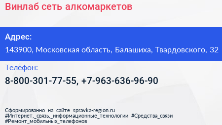 Винлаб, сеть алкомаркетов по адресу 143900, Московская область, Балашиха, Твардовского, 32 в дальнейшем Организация, размещена в следующих категориях: