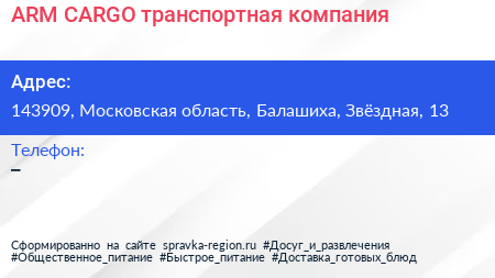 ARM-CARGO, транспортная компания по адресу 143909, Московская область, Балашиха, Звёздная, 13 в дальнейшем Организация, размещена в следующих категориях: