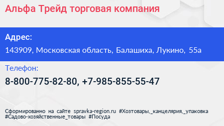 Альфа-Трейд, торговая компания по адресу 143909, Московская область, Балашиха, Лукино, 55а в дальнейшем Организация, размещена в следующих категориях: