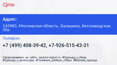 Cjme по адресу 143985, Московская область, Балашиха, Автозаводская, 50а в дальнейшем Организация, размещена в следующих категориях: