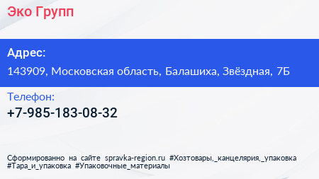 Эко-Групп по адресу 143909, Московская область, Балашиха, Звёздная, 7Б в дальнейшем Организация, размещена в следующих категориях: