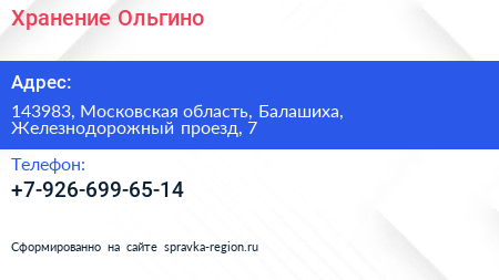 Хранение Ольгино по адресу 143983, Московская область, Балашиха, Железнодорожный проезд, 7 в дальнейшем Организация, размещена в следующих категориях:
