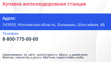 Купавна, железнодорожная станция по адресу 143920, Московская область, Балашиха, Шоссейная, 6Б в дальнейшем Организация, размещена в следующих категориях: