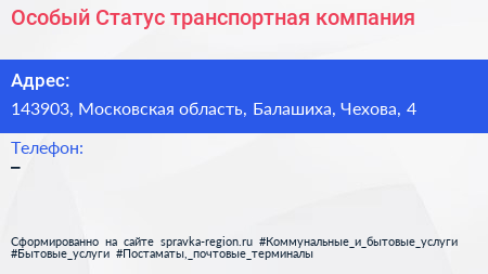 Особый Статус, транспортная компания по адресу 143903, Московская область, Балашиха, Чехова, 4 в дальнейшем Организация, размещена в следующих категориях: