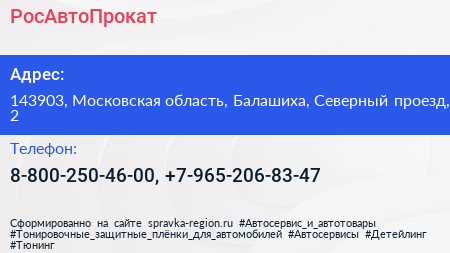 РосАвтоПрокат по адресу 143903, Московская область, Балашиха, Северный проезд, 2 в дальнейшем Организация, размещена в следующих категориях: