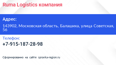 Ruma Logistics, компания по адресу 143902, Московская область, Балашиха, улица Советская, 56 в дальнейшем Организация, размещена в следующих категориях: