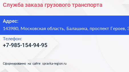 Служба заказа грузового транспорта по адресу 143980, Московская область, Балашиха, проспект Героев, 3 в дальнейшем Организация, размещена в следующих категориях: