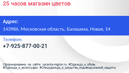 25 часов, магазин цветов по адресу 143986, Московская область, Балашиха, Новая, 14 в дальнейшем Организация, размещена в следующих категориях: