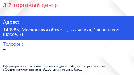 3+2, торговый центр по адресу 143986, Московская область, Балашиха, Саввинское шоссе, 7Б в дальнейшем Организация, размещена в следующих категориях: