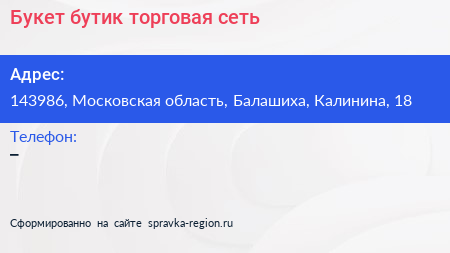 Букет бутик, торговая сеть по адресу 143986, Московская область, Балашиха, Калинина, 18 в дальнейшем Организация, размещена в следующих категориях:
