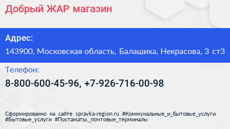 Добрый ЖАР, магазин по адресу 143900, Московская область, Балашиха, Некрасова, 3 ст3 в дальнейшем Организация, размещена в следующих категориях: