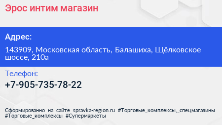 Эрос, интим-магазин по адресу 143909, Московская область, Балашиха, Щёлковское шоссе, 210а в дальнейшем Организация, размещена в следующих категориях: