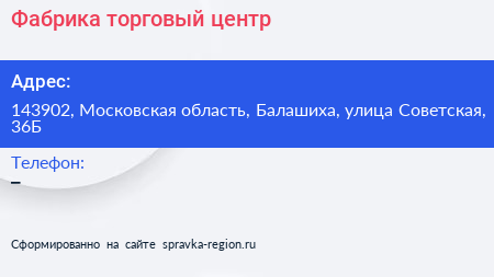 Фабрика, торговый центр по адресу 143902, Московская область, Балашиха, улица Советская, 36Б в дальнейшем Организация, размещена в следующих категориях: