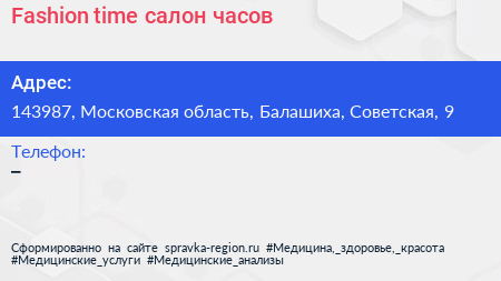 Fashion time, салон часов по адресу 143987, Московская область, Балашиха, Советская, 9 в дальнейшем Организация, размещена в следующих категориях: