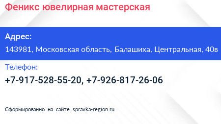Феникс, ювелирная мастерская по адресу 143981, Московская область, Балашиха, Центральная, 40в в дальнейшем Организация, размещена в следующих категориях: