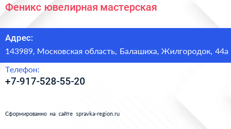 Феникс, ювелирная мастерская по адресу 143989, Московская область, Балашиха, Жилгородок, 44а в дальнейшем Организация, размещена в следующих категориях: