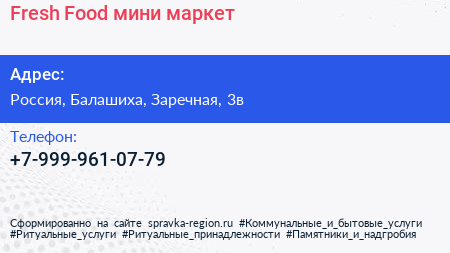 Fresh Food, мини-маркет по адресу Торгово-развлекательный центр "Маруся", Зенинское шоссе, Марусино, городской округ Люберцы, Московская область, Центральный федеральный округ, 140008, Россия в дальнейшем Организация, размещена в следующих категориях: