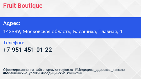 Fruit Boutique по адресу 143989, Московская область, Балашиха, Главная, 4 в дальнейшем Организация, размещена в следующих категориях: