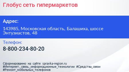 Глобус, сеть гипермаркетов по адресу 143985, Московская область, Балашиха, шоссе Энтузиастов, 48 в дальнейшем Организация, размещена в следующих категориях: