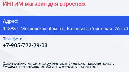ИНТИМ, магазин для взрослых по адресу 143987, Московская область, Балашиха, Советская, 26 ст1 в дальнейшем Организация, размещена в следующих категориях: