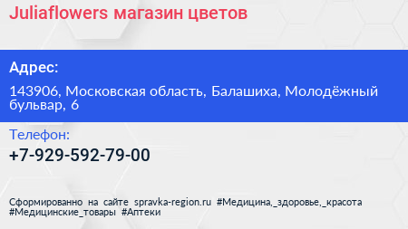 Juliaflowers, магазин цветов по адресу 143906, Московская область, Балашиха, Молодёжный бульвар, 6 в дальнейшем Организация, размещена в следующих категориях: