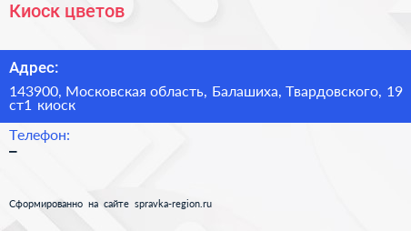 Киоск цветов по адресу 143900, Московская область, Балашиха, Твардовского, 19 ст1 киоск в дальнейшем Организация, размещена в следующих категориях: