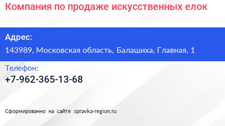 Компания по продаже искусственных елок по адресу 143989, Московская область, Балашиха, Главная, 1 в дальнейшем Организация, размещена в следующих категориях: