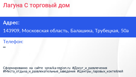 Лагуна-С, торговый дом по адресу 143909, Московская область, Балашиха, Трубецкая, 50а в дальнейшем Организация, размещена в следующих категориях: