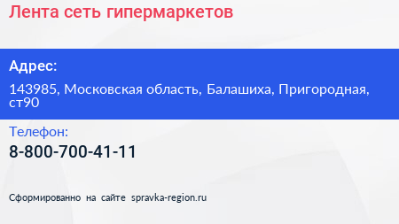 Лента, сеть гипермаркетов по адресу 143985, Московская область, Балашиха, Пригородная, ст90 в дальнейшем Организация, размещена в следующих категориях: