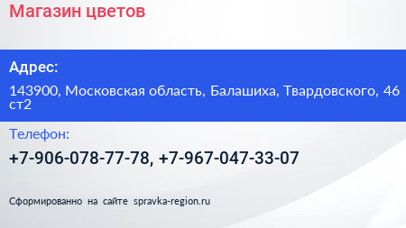 Магазин цветов по адресу 143900, Московская область, Балашиха, Твардовского, 46 ст2 в дальнейшем Организация, размещена в следующих категориях: