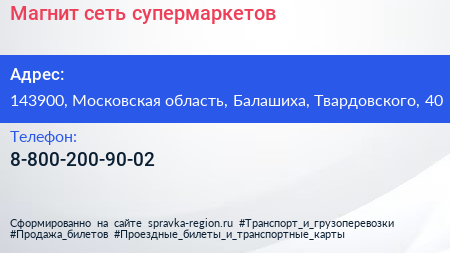 Магнит, сеть супермаркетов по адресу 143900, Московская область, Балашиха, Твардовского, 40 в дальнейшем Организация, размещена в следующих категориях: