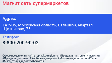 Магнит, сеть супермаркетов по адресу 143906, Московская область, Балашиха, квартал Щитниково, 75 в дальнейшем Организация, размещена в следующих категориях: