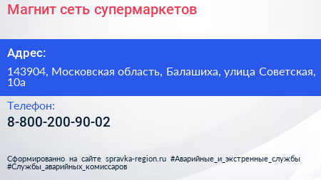 Магнит, сеть супермаркетов по адресу 143904, Московская область, Балашиха, улица Советская, 10а в дальнейшем Организация, размещена в следующих категориях: