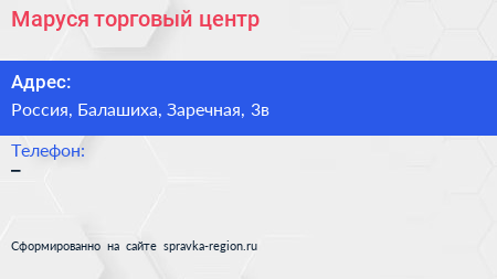 Маруся, торговый центр по адресу Торгово-развлекательный центр "Маруся", Зенинское шоссе, Марусино, городской округ Люберцы, Московская область, Центральный федеральный округ, 140008, Россия в дальнейшем Организация, размещена в следующих категориях: