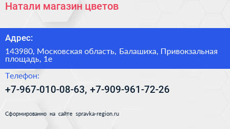 Натали, магазин цветов по адресу 143980, Московская область, Балашиха, Привокзальная площадь, 1е в дальнейшем Организация, размещена в следующих категориях: