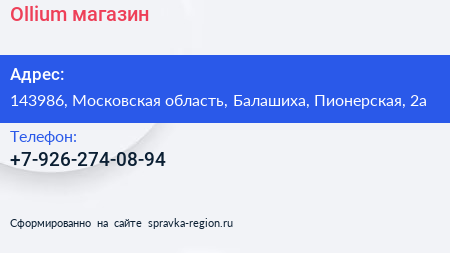 Ollium, магазин по адресу 143986, Московская область, Балашиха, Пионерская, 2а в дальнейшем Организация, размещена в следующих категориях: