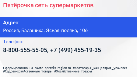 Пятёрочка, сеть супермаркетов по адресу Пятёрочка, 106, улица Ясная поляна, СНТ «Ясная Поляна», Полушкино, Раменский городской округ, Московская область, Центральный федеральный округ, 140143, Россия в дальнейшем Организация, размещена в следующих категориях:
