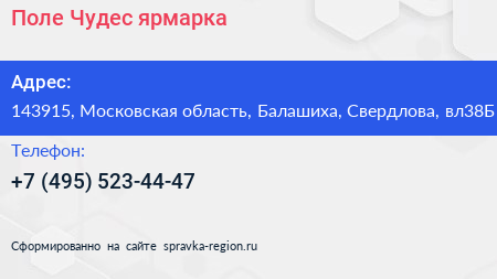 Поле Чудес, ярмарка по адресу 143915, Московская область, Балашиха, Свердлова, вл38Б в дальнейшем Организация, размещена в следующих категориях: