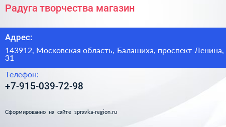 Радуга творчества, магазин по адресу 143912, Московская область, Балашиха, проспект Ленина, 31 в дальнейшем Организация, размещена в следующих категориях: