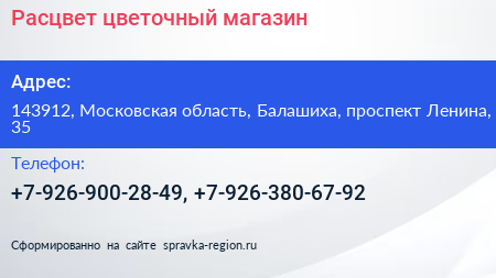 Расцвет, цветочный магазин по адресу 143912, Московская область, Балашиха, проспект Ленина, 35 в дальнейшем Организация, размещена в следующих категориях:
